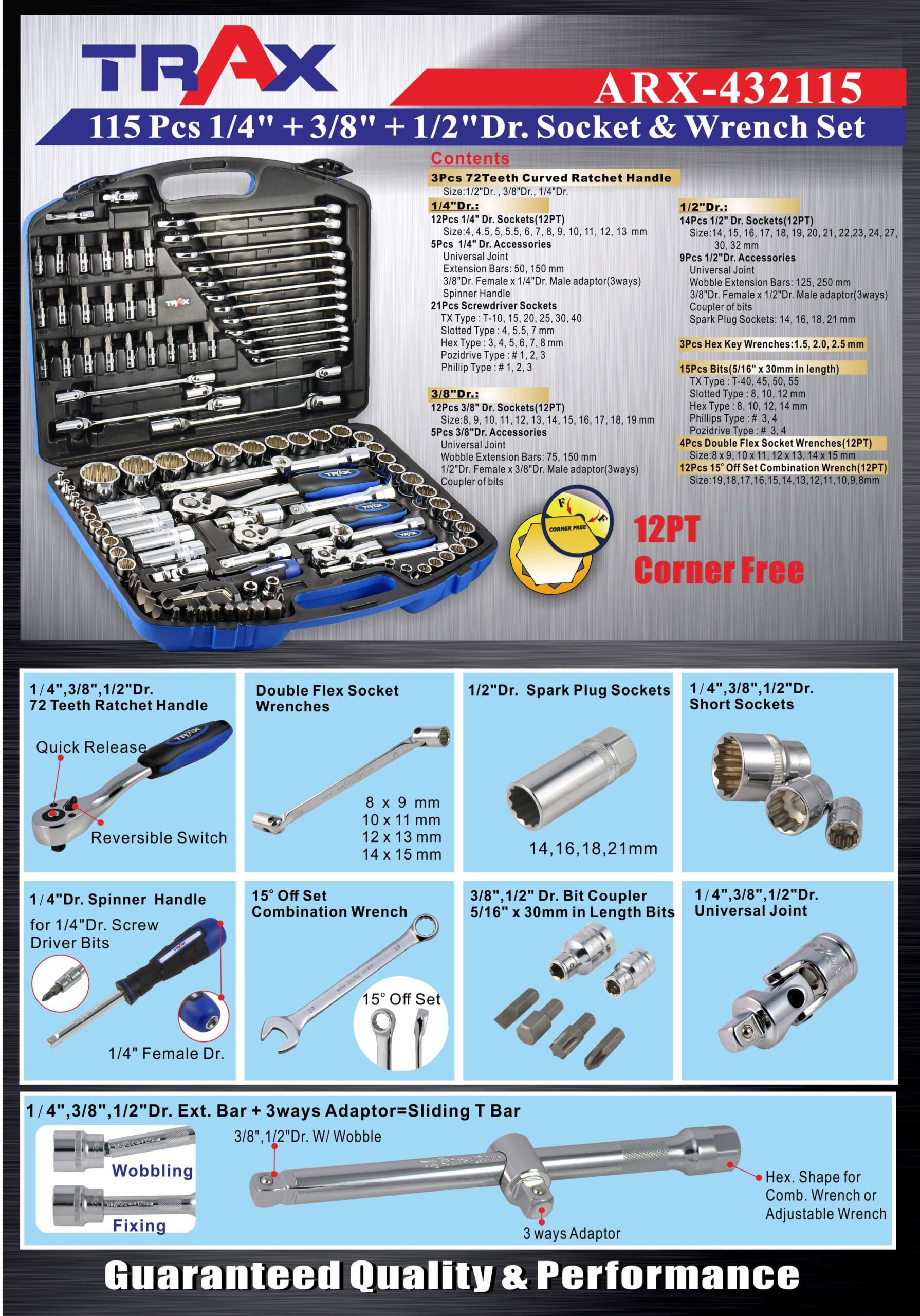 ARX-432115 [115 PC 1/4”+ 3/8”+ 1/2″DR. Socket & Wrench Set ]