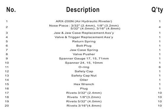 | Capacity | Steel Rivets : Min. 3/32”(2.4mm) Max. 3/16”(4.8mm)Stainless Rivets : Max. 5/32”(4.0mm) |
