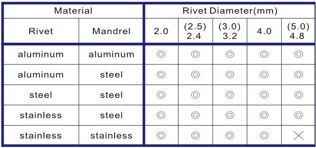 | Capacity | Steel Rivets : Min. 3/32”(2.4mm) Max. 3/16”(4.8mm)Stainless Rivets : Max. 5/32”(4.0mm) |