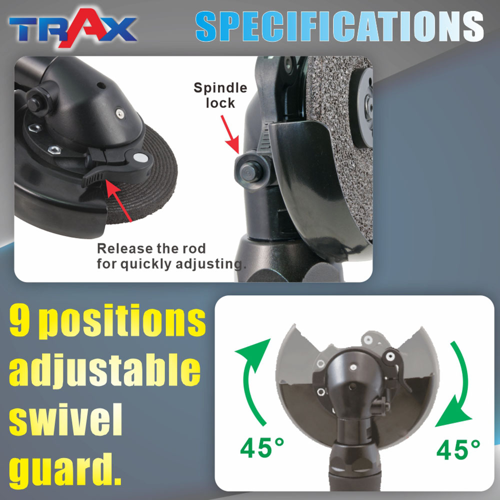 9 position adjustable swivel guard– 90° adjustable for better operator protection & greater visibility of cutting operation.